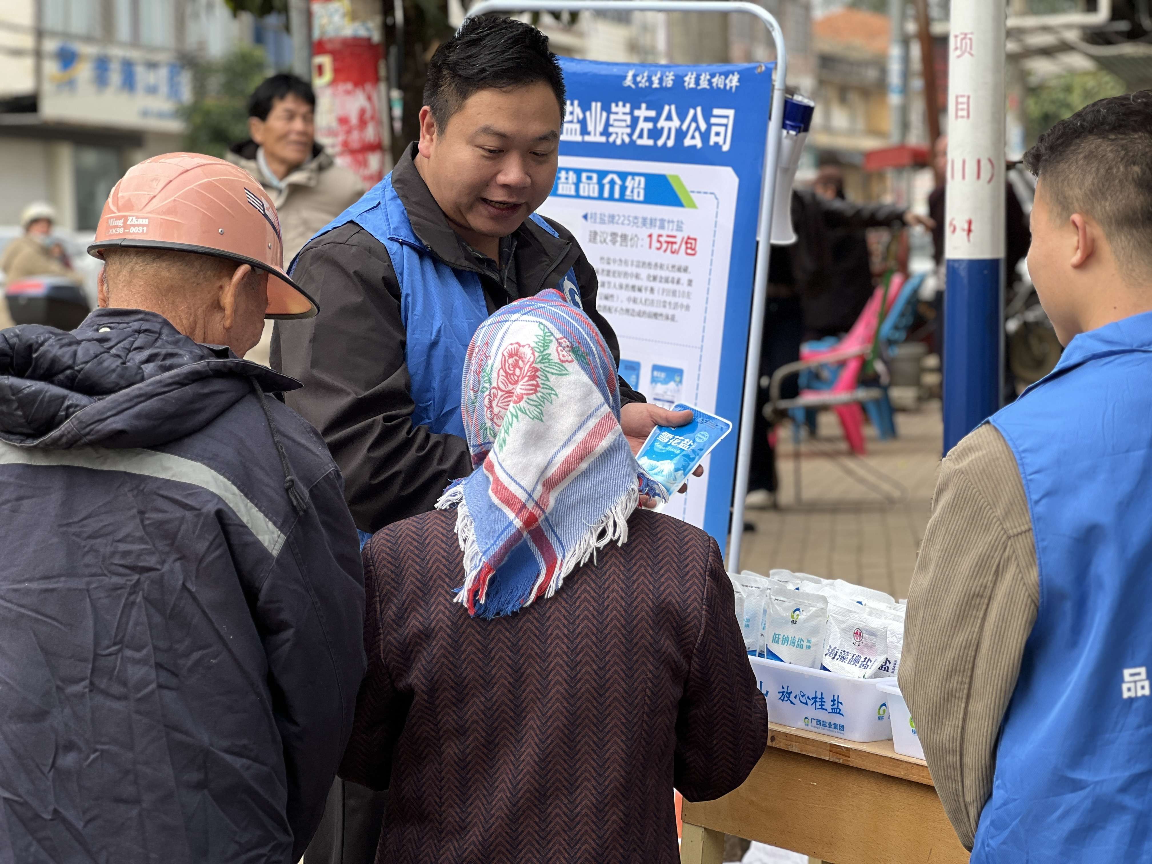 抢花炮决赛后,广西z6com人生就是博集团崇左分公司巧妙地在巡游的必经之路上摆摊设点开展地推运动,借着热闹的人流,让四方闻讯而来的民众在陶醉式体验民族古板节日魅力的同时,还能深入了解健康用盐知识,进一步了解“桂盐”“桂山”品牌 。